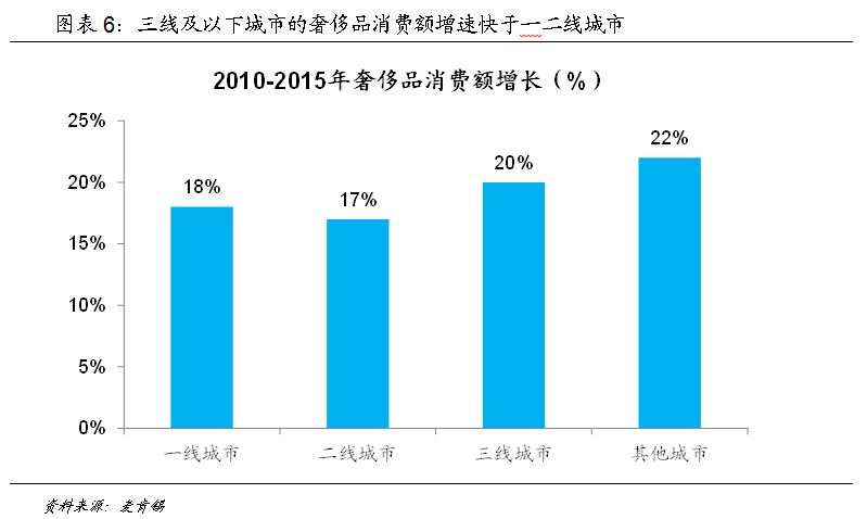 实际上,随着中国经济的快速发展,中国人已经不满足于传统的“衣食住行”,对于更高层级消费的需求正在不断酝酿,一个典型案例是对于奢侈品的消费,中国的消费者已经贡献了全球奢侈品消费三分之一的购买量,而根据麦肯锡的预测,这一比例到2025年将达到44%,而奢侈品的购买主力变化更加说明了这一消费升级的趋势,2008年68%的奢侈品消费来自于高收入群体,而到2016年,有88%的奢侈品消费来自于富裕群体,从不同层级城市的奢侈品消费额对比看,三线及以下城市的奢侈品消费增长要快于一二线城市,这正是消费升级的体现。