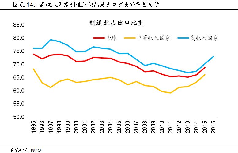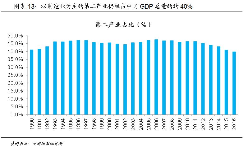 虽然以消费和服务行业为主的新经济正在快速崛起,但以制造业为主的第二产业仍然是中国当前经济的核心支柱,第二产业的比重虽然有所下降,但仍然维持在约40%。同时,从高收入经济体的经验看,制造业仍然是出口贸易中保持核心竞争力的核心要素。