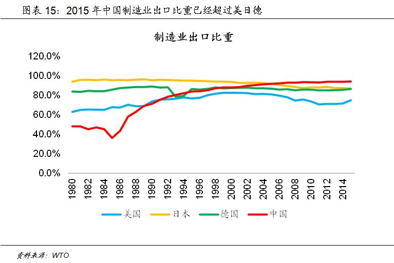 作为大国,中国不能完全依赖于服务业和消费行业,制造业未来的转型同样重要,这种转型更多体现为在价值链上的迁移,从过去的注重低端制造业向中高端制造业转变。如果对比中国和美国、德国、日本等制造业强国的出口结构,可以明显看到,虽然中国在全球贸易中的参与度高,但更多体现为低附加值的出口商品。