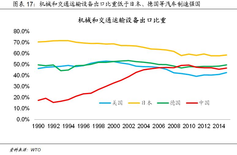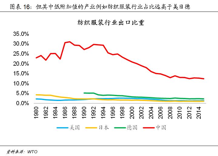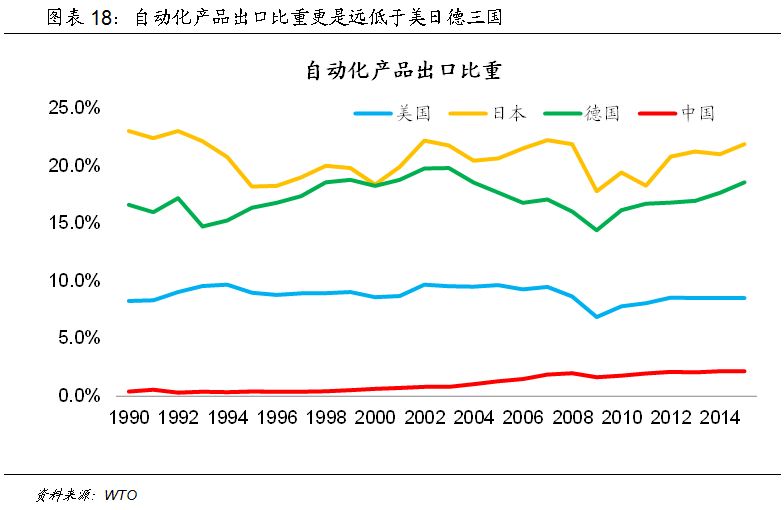 例如,虽然从笼统的制造业口径上看,2015年中国的制造业出口占比达到94.4%,超过美国、日本和德国,但如果仔细拆分制造业的出口结构可以看到,其中低附加值的制造业,例如纺织服装行业,中国的出口比重虽然自90年代末以来明显下降,但仍保持在12.4%的高位,远高于美国(1.3%)、日本(1.1%)和德国(2.3%);而高附加值的行业,例如机械和交通运输设备行业的出口比重为46.8%,相比汽车制造业强国日本(58.7%)和德国(49.7%)仍然存在差距;在自动化产品出口方面,中国出口比重仅为2.2%,更是远低于美国(8.5%)、日本(21.9%)和德国(18.6%)。
