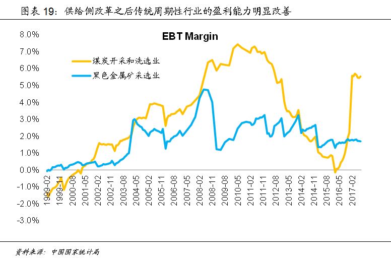 中国从2015年开始推行的供给侧改革在这些传统老经济行业清理了一大批过剩产能,不仅如此,这些行业未来的新增供给也变得更加有纪律,改革的直接结果是代表高端优质产能的行业龙头盈利能力更强,从国家统计局提供的数据可以看到,以煤炭和钢铁行业为例,税前利润率得到大幅提升。在盈利改善后,这些行业龙头企业已经开始内生的资产负债表的修复,这将有助于解决中国工业企业现在面临的高杠杆率问题。