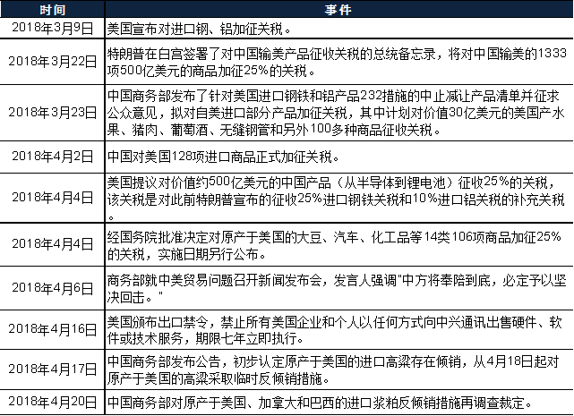 3月22日特朗普总统在白宫签署了对中国输美产品征收关税的总统备忘录,将对1333项共计500亿美元的商品加征25%的关税,此后中国在4月2日对美国128项进口商品正式加征关税,中美本轮贸易战正式打响。此后在4月4日前后,中美再次交锋,面对美国的加征关税,中国商务部提出拟对原产于美国的大豆、汽车、化工品等商品加征25%的关税,实施日期另行公布。4月16日,美国对中兴通讯出手,禁止所有美国企业和个人以任何方式向中兴通讯出售硬件、软件或技术服务,期限七年立即执行。中国随后进行了反击,于17日宣布对原产于美国的高粱采取临时反倾销,20日宣布对原产于美国、加拿大和巴西的进口浆粕采取反倾销再调查裁定。