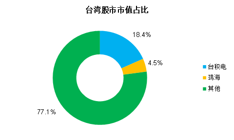 例如对于台湾市场而言,苹果产业链大约占据台湾国内电子行业总产值的35-40%,而其中大部分工厂可能位于中国大陆,如果中国对美电子出口被限制,这些工厂将受到很大影响,代表性的厂商例如台积电、鸿海等。而台湾股票市场失衡的结构将使得投资者面临更大的风险,台积电和鸿海两家就占据了台湾股市23%的市值。