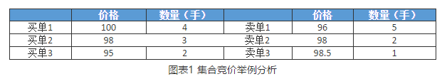 规定集合竞价时间的撮合过程简述如下:首先,遵循价格优先的原则,进行买入价格最高的买单1和卖出价格最低的卖单1之间的成交,成交数量为4手,为同时满足买入价格为100元的买单与卖出价格为96元的卖单,成交价格需要在96-100元之间。其次,进行买单2与卖单1的成交,成交量为1手,成交价格的范围进一步被缩窄至96-98元。第三,进行买单2与卖单2 的成交,成交量为2手,成交价格确定为98元。至此卖单1和2、买单1和2全部成交,而买单3的买入委托价低于卖单3的卖出委托价,故无法成交。最后一笔成交价格98元即为集合竞价产生的交易价格,所有委托均按照这一价格成交(若最后一笔买单与卖单的委托价格不相等,则二者的平均价格即为此次集合竞价的价格),成交总量为7手。