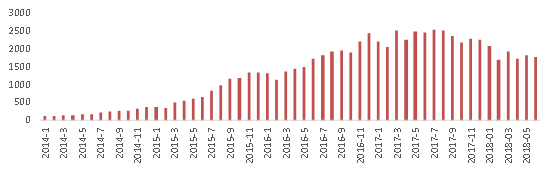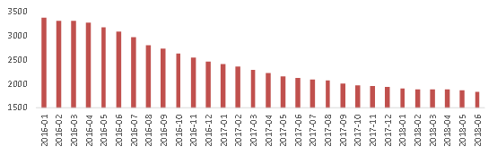 2016年至今正常运营平台数量一直持续减少,截止至2018年6月仅剩1836家。平台数量减少主要有两方面原因:(1)监管趋严,平台自身问题暴露后无法达到合规要求而导致难以继续运营,最终只能选择退出行业;(2)行业门槛提高造成新增平台数量减少。