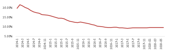 自2014年2月起至2016年9月,综合参考投资收益率逐步下降,之后进入相对稳定期,在9%到10%之间波动。2018年6月收益率为9.62%,环比小幅降低6个基点,同比增长32个基点。这或与当下借款项目倾向于长期标的有关,借款期限较长的标的一般收益率相对更高,带动行业综合收益率同比小幅上升。