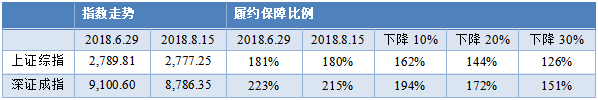 不考虑补充质押与股息的情况下,履约保障比例的简化形式为:当前质押股票的市值/融资待偿金额,股票价格下降将导致履约保障比例等比例地下降。A股市场受到贸易战、全球经济不确定性的影响出现下跌,2018年6月26日到2018年8月15日上证综指与深证成指分别下跌了0.45%和3.35%,因此目前上交所与深交所股权质押的加权平均履约保障比例估计值为180%和215%。
