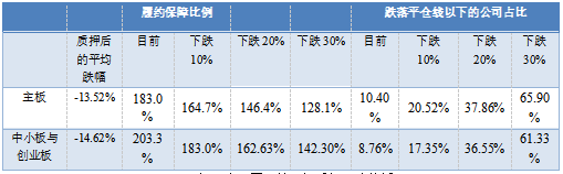 首先,分析目前整体层面的履约保障比例。2018年6月26日,上海证券交易所、深圳证券交易所分别发布公告称上交所与深交所股票质押的市值加权平均履约保障比例分别为181%和223%,均远低于主板与中小板、创业板股票的平仓线(大致区间为130%-150%),因此认为股权质押风险整体可控。