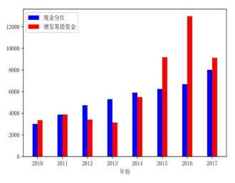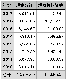图表3:2008-2017中国股市的现金分红和增发配股筹措资金。单位:亿元。 |