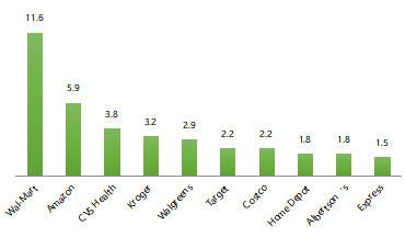图1:2017年中、美零售市场占有率前10公司(%)