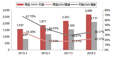 图3:2013年3月至2018年3月淘宝、天猫GMV(十亿人民币)