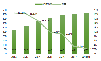 图5:2012年至2018年上半年高鑫零售门店规模、销售收入、同店销售增速情况