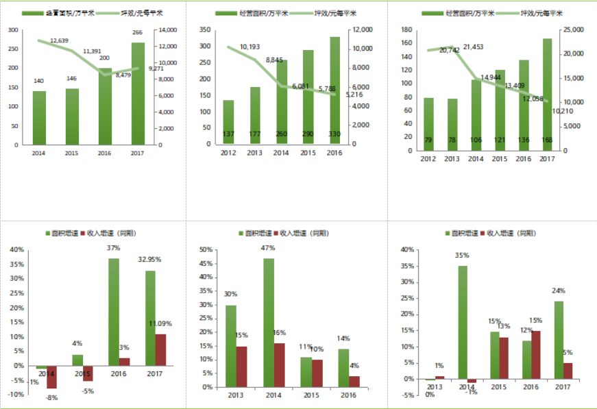说明:①第一行从左至右图表分别反映的是王府井百货、银泰商贸集团、金鹰商贸集团面积与坪效情况,第二行从左至右图表分别反映的是王府井百货、银泰商贸集团、金鹰商贸集团面积增速与收入增速情况。尽管各大百货零售企业持续扩大经营面积,但收入增速远低于营业面积增速,坪效普遍走低。其中,银泰商贸集团已于2017年1月,被阿里巴巴私有化(74%)②坪效=销售额/经营面积③数据来源:公司年报
