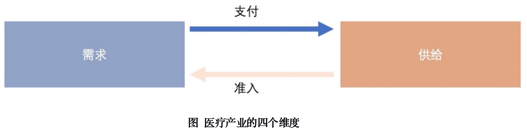 从宏观格局看,整个医疗产业可通过四个维度进行考察——需求、供给、准入和支付,这四个维度共同构筑了一个完整的医疗服务链条和价值实现周期,即患者的医疗需求通过一定的准入渠道从供给方获得满足,再全部或部分通过第三方实现支付,见图“医疗产业的四个维度”。在传统的医疗服务体系内,需求通常产生于患者出现症状(一般在显性化之后),然后通过信息和物理的准入到达供给方。供给方通常为医疗机构或药店,它们会对患者的信息或数据进行判断并给出解决方案即治疗或处方,提供服务。患者最后根据供给方报价全部或部分通过第三方支付方(不同形式的医疗保险)进行支付。