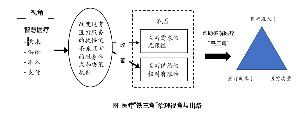这就是医疗“铁三角悖论”带来的治理困境,长时间困扰决策者。当然威廉·基西克的铁三角概念并不是绝对的,三重目标也可以同时实现,只不过同时实现特别具有挑战性,需要突破性创新思维。本文认为,作为传统医疗的一种突破性创新方式,智慧医疗(Smart Healthcare)可在很大程度上帮助改变整个医疗产业的格局并打破原有的医疗铁三角困局。