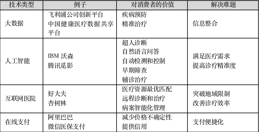 在广州举办的2017财富全球论坛上,许多与会嘉宾就曾指出,对于疾病预防,大数据分析加中西医结合是颇具潜力的发展方向。一些科技企业如飞利浦公司等,也正致力于打造预防性解决方案。目前飞利浦已在中国建立了一个创新平台,旨在通过中西方合作来了解疾病根源,从而进行有效预防。除此之外,其他公司如IBM、腾讯、阿里巴巴等,也在利用大数据、人工智能、远程医疗、移动医疗、物联网、在线支付等技术开展或尝试开展个体化医疗和精准医疗,这些探索均在客观上缓解了医疗需求无限性与医疗供应相对有限这对矛盾,从而从需求端帮助破解“铁三角”困局,见表“个体化医疗和精准医疗技术创新与解决难题”。
