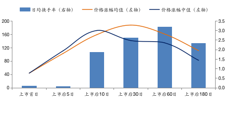 2018年,A股上市5日后的区间涨幅均值与中值分别为102.94%和110.81%(上市后5日的收盘价相对于开盘价的涨跌幅,即包含IPO首日涨幅),上市5日内的日均换手率为0.029%,交易活跃程度依然不高。IPO后30日涨幅均值达到187.64%,30日内的日均换手率回升至2.61%,与2018年A股日均换手率基本相当(A股2018年日均换手率为2.31%)。上市2个月后,涨幅均值为160.79%,换手率继续提升至3.17%。之后涨幅有所回落,上市后180日区间内的涨幅均值下降至111.49%,中值降至82.35%。