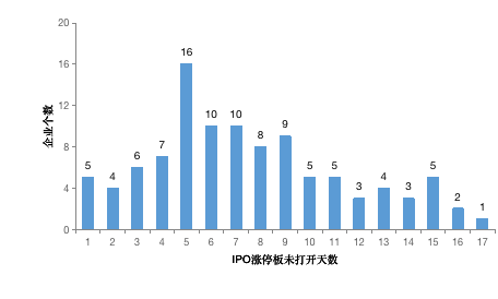 IPO首日之后恢复10%的涨停限制,但交易量持续偏低,且继续封至涨停。从整体上看,2018年IPO个股平均7天打开涨停板。开板后首个交易日,股票涨幅的均值与中值分别为4.58%与6.81%。下图分析了2018年IPO涨停天数的频数分布,涨停板时间最长的IPO是彩讯股份(17天)、药明康德与天地数码(16天),5家企业上市后第二天即打开涨停板,分别是养元饮品、华宝股份、长沙银行、上机数控与今创集团。