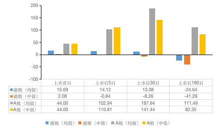 对港股历史上IPO首日涨幅进行排序,发现2015年至2016年间有22家公司IPO首日涨幅超过1000%,这些公司新股发行价格普遍较低,均不足1港元,发行首日价格大涨,但首日后出现下降。为了剔除上述异常值对均值统计的影响,故对上市N日(N=0、5、30、180,N=0代表IPO首日)涨跌幅进行中值分析。