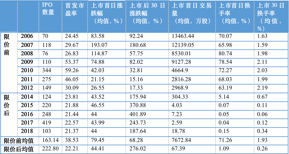 为了回答这一问题,我们不妨对比分析A股IPO限价前后的市场概况。由于2005年5月至2006年A股IPO暂停一年,进行股权分置改革。为保证考察区间内市场状态的延续性,采用2006年至2012年数据作为IPO限价前阶段(2013年IPO暂停),2014年至2018年作为限价后阶段。