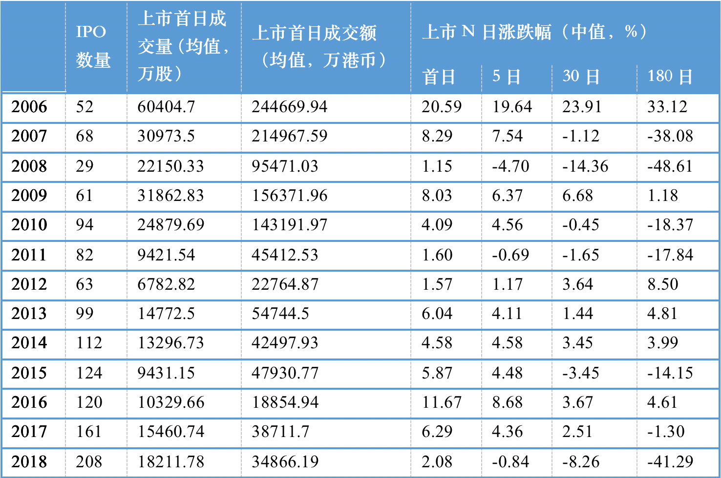 从整体上看,港股IPO市场化程度较强,投资者随市场行情给予IPO定价。2006年港股IPO首日涨幅中值为20.59%,随后受到金融危机的影响首日涨幅有所下降,2014年至2016年首日涨幅有所回升,2016年港股IPO涨幅中值为11.67%,2018年降至2.08%。同时,随着交易量的持续稳定,港股IPO价格并无持续上涨的趋势,2018年IPO后5日内涨幅中值为负,说明一半以上的港股在IPO后5日内出现破发。