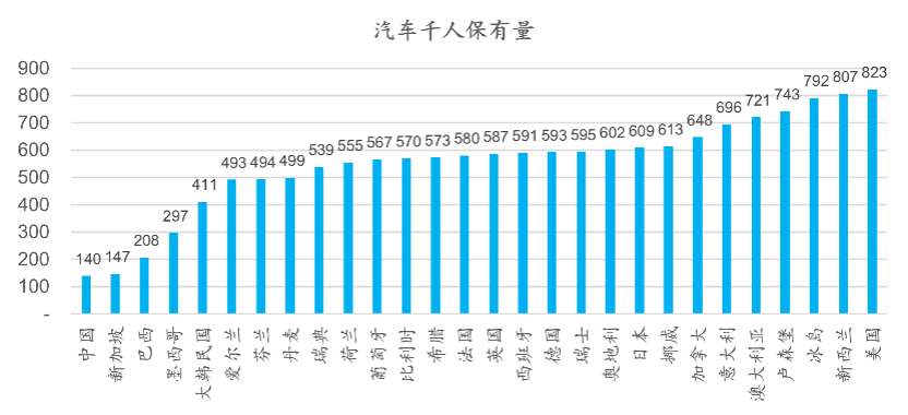 虽然总量盘子大,但作为全球销量第一的单一市场,我国的千人汽车保有量仅有140辆,基本与全球汽车保有量平均水平持平,但相较其他发达市场而言,美国千人汽车保有量为823辆,日本为609辆,韩国为411辆。