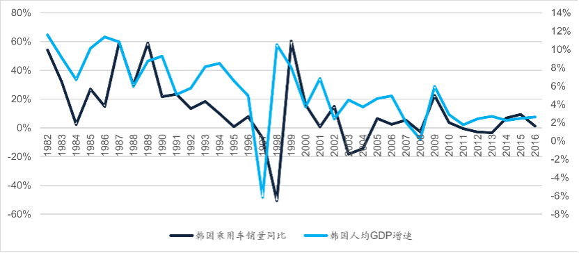 从韩国的情况看,乘用车销量和经济增速相关性极强,1997年的亚洲经济危机使得韩国汽车销量创下历史最低增长,同时保有量也罕见地出现了唯一的一次下滑,危机之后又重拾增长。
