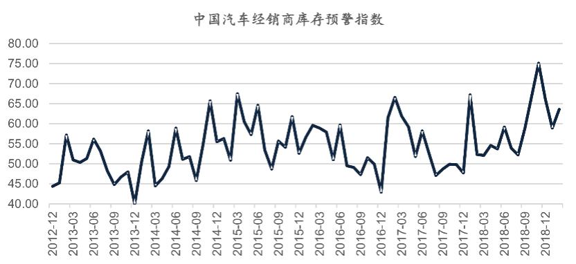 一般健康的经销商库存水平在1-1.4个月之内波动。为保障稳定的价格体系,各大车企于11-12月开始去库存工作。1月份经销商库存系数已降到警戒线以下,库存压力缓解初见成效(月度经销商库存指数)。但中国汽车流通协会发布的最新一期“中国汽车经销商库存预警指数调查”显示,2019年2月,汽车经销商库存预警指数为63.6%,环比上升4.7%,同比上升11.3%,库存预警指数位于警戒线之上(月度经销商库存预警指数)。主要由于2月工作日减少,又逢春节假期,客流量明显减少,导致销量下滑。部分经销商在春节前清库存,调整2月进车节奏,导致当月库存预警指数再度上扬,目前看仍然维持在警戒线之上,高位徘徊。