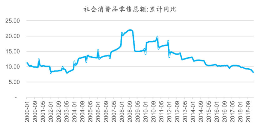 图表8:汽车销量下滑带累2018年社会消费品零售总额增速创新低