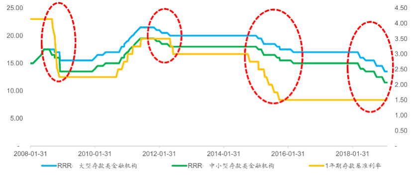 在中国,政策制定者通常采用“量”作为货币政策调节的准绳,特别是本轮经济周期中表现得更为明显。2018年美联储整体货币政策仍然呈现收紧态势,加息节奏并未明显放缓,在资本外流的压力下,中国央行通过利率宽松的政策空间被大大限制,因此主要通过货币总量供给的相关指标逆周期调节经济。2018年全年,中国央行分别在4月、6月和10月共三次通过“定向降准”的方式,合计降低存款准备金率250个bp。2019年1月4日,央行公告下调金融机构存款准备金率1个百分点,从“定向宽松”转为“全面宽松”。