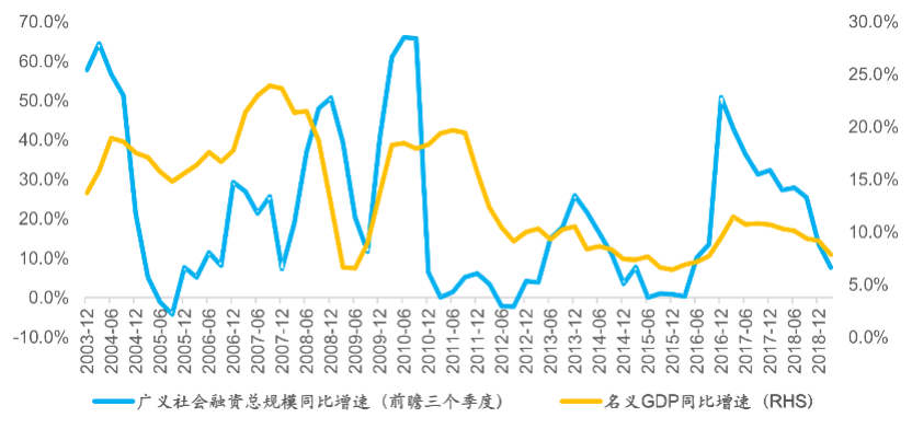 从历史经济表现看,中国的金融统计数据是实体经济较好的领先变量,相关性程度最高的是所谓广义社会融资总量指标,即综合考虑了非金融企业、地方政府等广义融资主体,在一段时间内从金融体系获得的资源总和,这一指标的同比增速基本领先名义GDP增速2-3个季度。事实上,中国经济在2018年出现的减速,主要原因就是在资管新规的影响下,信托贷款、委托贷款等为主的表外融资渠道在2018年上半年大幅收缩,这种压力随后体现在下半年的实体经济增速上,整体时滞在3个季度左右。