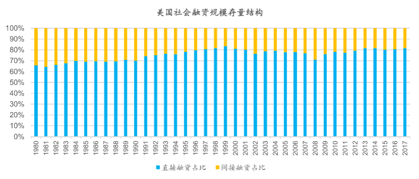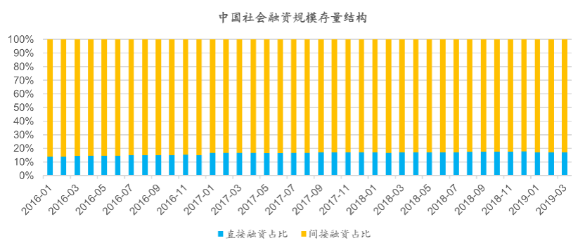 由于中国的经济发展路线属于典型的转轨经济,因此商业银行主导了整体融资体系,我们采用存量的社会融资规模测算结构,截止到2019年一季度末,中国存量社融结构中直接融资占比为17.1%,即静态地看,17.1%的金融资源是通过商业银行等金融中介进行配置。而相较而言,美国的存量社会融资规模结构中直接融资占比在2017年已经达到81.6%,这也是中美两大经济体在金融资源整体配置上的最大不同。