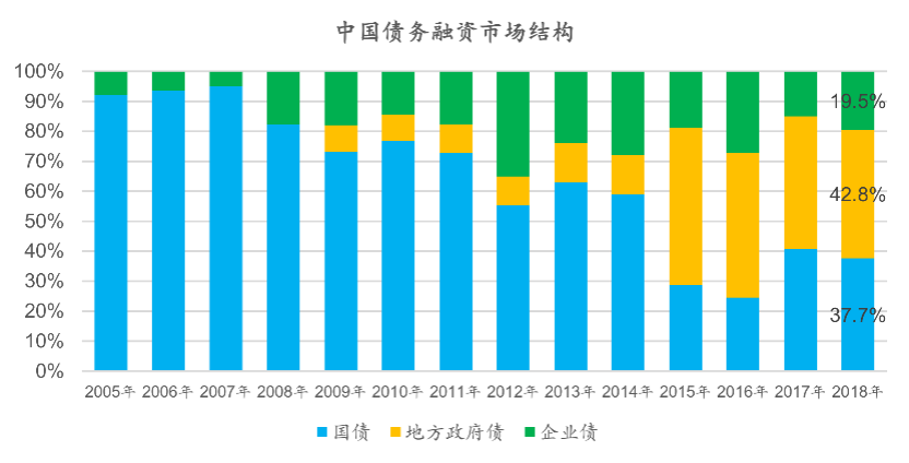 如果进一步拆分中国的债务融资市场可以看到,这一市场的资源供给也表现出不平衡,国债和地方政府债是中国债务资本融资占比最高的主体,以2018年为例,国债和地方政府债券分别占据了37.7%和42.8%的新发债券规模,以非金融企业为主体的债务融资规模仅占据不到20%。此外需要注意的是,中国存在一种特殊的企业债券——地方政府融资平台债,这类债券虽然融资主体是企业,但事实上由地方政府提供信用担保,相当于变相的地方政府债券。综合而言,中国的债务融资市场中真正能够流向非金融企业的少之又少,而其中大型国有企业又凭借其“准政府”的信用背书,占据了相当可观的融资份额,民营企业发债融资通常难度较大。