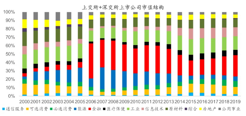 图表15:上交所和深交所上市公司中金融、工业和原材料行业占比较高