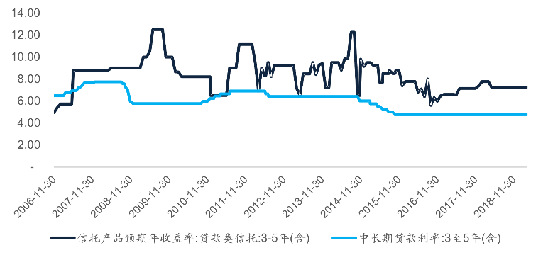 由于在传统商业银行体系内不能满足金融资源的需求,小微企业和民营企业通常需要寻求其他间接融资渠道,例如信托贷款、委托贷款等典型的非标融资渠道,但事实上,由于这些渠道经过的中介环节更多,每增加一层融资中介,通常会增加通道费的成本,因此融资成本要显著高于通过传统商业银行体系获得资金的成本。以信托贷款为例,可以以贷款类信托产品预期年收益率作为这一渠道融资成本的代理变量,但需要说明的是,实际成本将更高,因为信托公司等融资中介需要赚取利润空间。以3-5年期产品为例,通过贷款类信托融资成本平均在7.25%,高出同期限商业银行贷款利率250个bp。