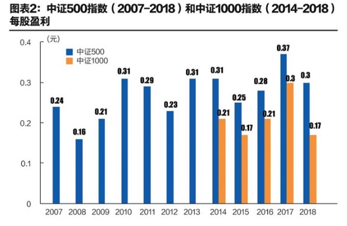 图表 2列出了中证 500指数(2007-2018年)和中证1000指数(2014-2018年)的每股盈利。总体上来看,中证500指数的每股盈利走势和万得全A的类似。值得指出的是,2010年的每股盈利上升到了0.31。此后的2011-2018年的每股盈利基本上都是围绕2010年的水平波动。每股盈利在2011、2012年下降到了0.29元、0.23元,在2013、2014年又回升到了0.31元;在2015年下降到了0.25元,又在2016、2017年上升到了0.28元、0.37元,最后在2018年回落到了0.3元、与2010年的0.31元几乎一样。