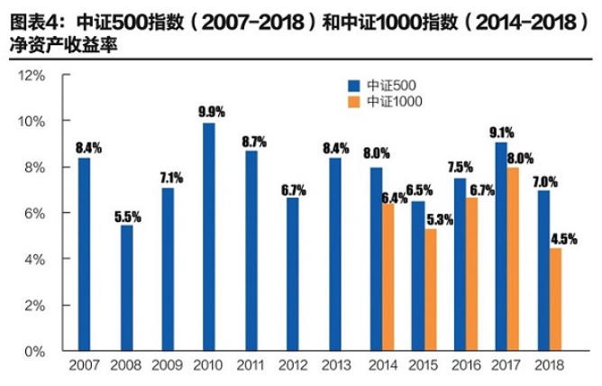 图表 4列出了中证 500指数(2007-2018年)和中证 1000指数(2014-2018年)的净资产收益率。在2007-2010年间,中证500指数的净资产收益率的走势与万得全A和沪深300指数的走势一致。净资产收益率从2007年的8.4%掉到了2008年的5.5%,随后又上升到了2010年的9.9%。在2011至2018年间,与万得全A和沪深300的下降趋势一致,中证500的净资产收益率也是逐步下降到了2018年的7.0%。但与万得全A和沪深300这两个指数不同的是,中证500的净资产收益率在2017年大幅反弹到了9.1%。