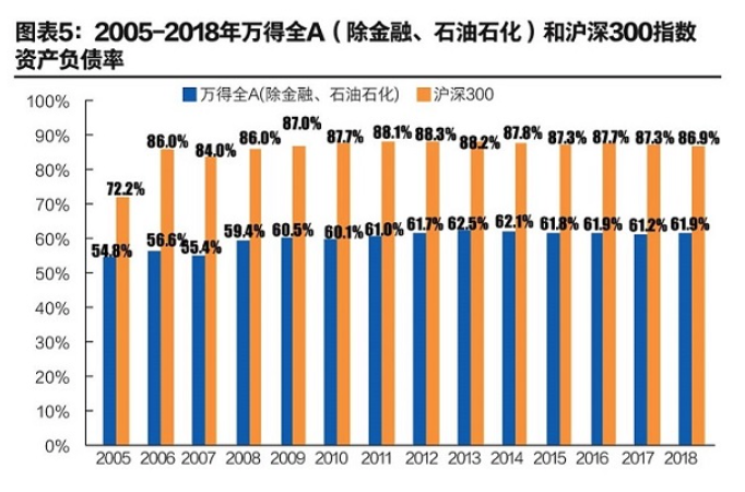 A股上市公司的资产负债率相当稳定。在金融危机以前的2005-2007年,资产负债率分别是54.8%、56.6%、55.4%;资产负债率在2008年的值是59.4%、在2009年又进一步上升到了60.5%。此后的2010-2018年资产负债率在61%±1.5%这个范围内小幅波动。2018年的平均资产负债率是61.9%。