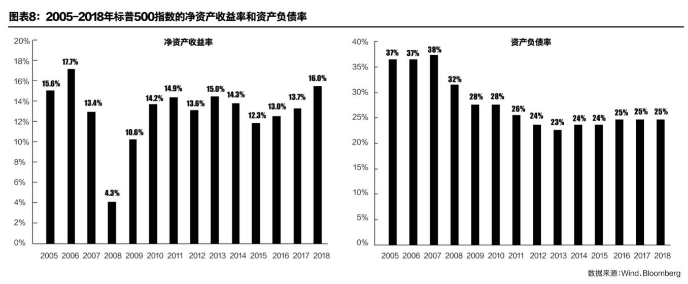 图表8的右栏列出了标普500指数在2005-2018年间的资产负债率。在金融危机以前的2005-2007年间,标普500的资产负债率稳定在37-38%。在2008年,资产负债率下降到了32%,此后连年下降到了2013年的23%。自2014年始,资产负债率开始回升,2014、2015年是24%,2016-2018年是25%。因此,自从2012年开始,标普500的资产负债率就非常稳定的在24%上下窄幅波动了。与沪深300指数相比,标普500指数的资产负债率要低很多,一大原因是美国主要依赖于股票市场的直接融资、而中国更多地依靠银行系统的间接融资。