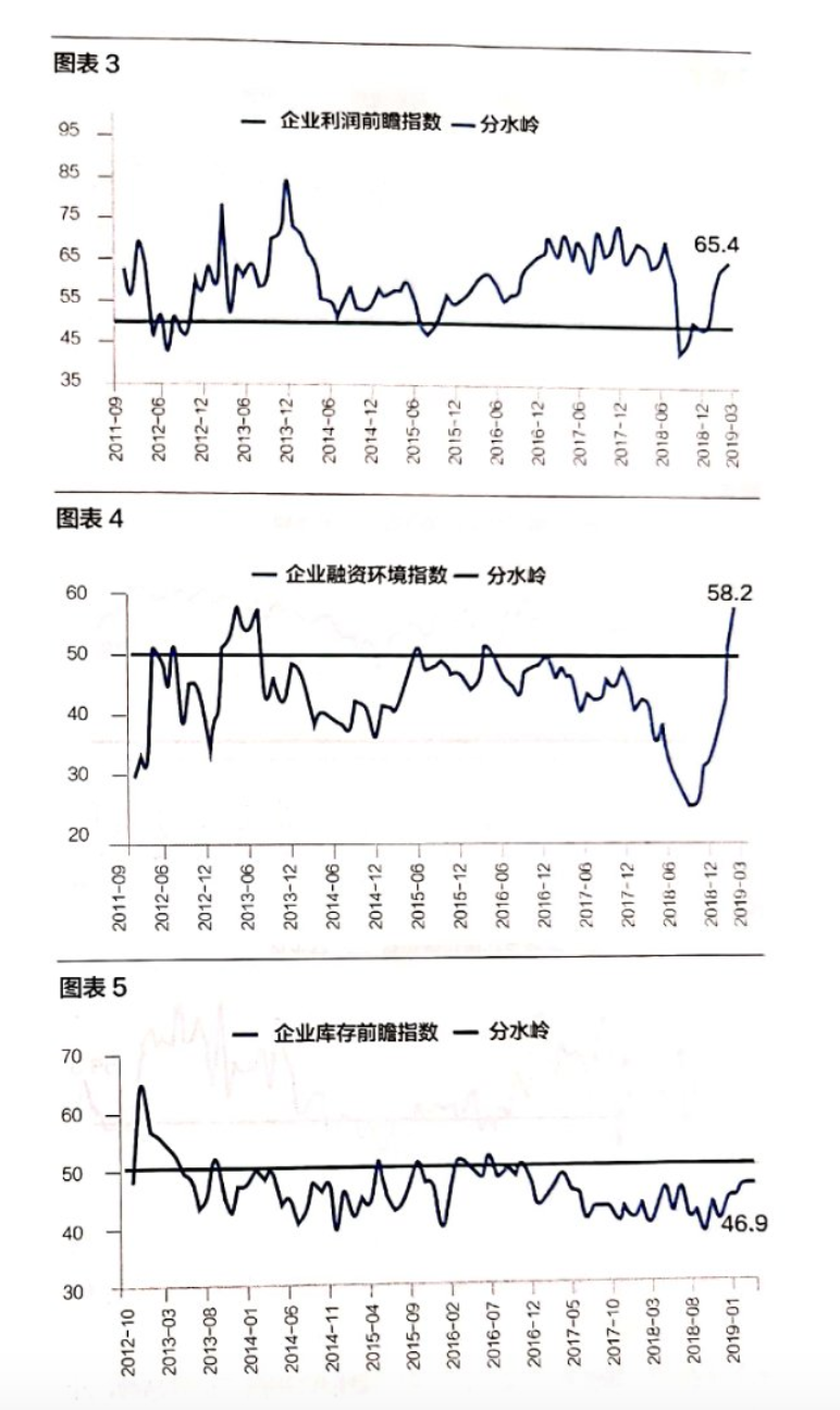 4月,四个分指数出现了“两升一平一降”的局面:企业销售前瞻指数由3月的77.5降至4月的77.1(图表2),利润前瞻指数由3月的63.9升至了4月的65.4(图表3)。企业融资环境指数继续反弹,3月为53.0,4月为58.2,目前是历史最高值。有趣的是,企业融资环境指数从历史最低值(24.2,2018年9月)爬升到历史最高值,仅用了7个月的时间。企业库存前瞻指数4月保持不变,仍为46.9(图表5)。