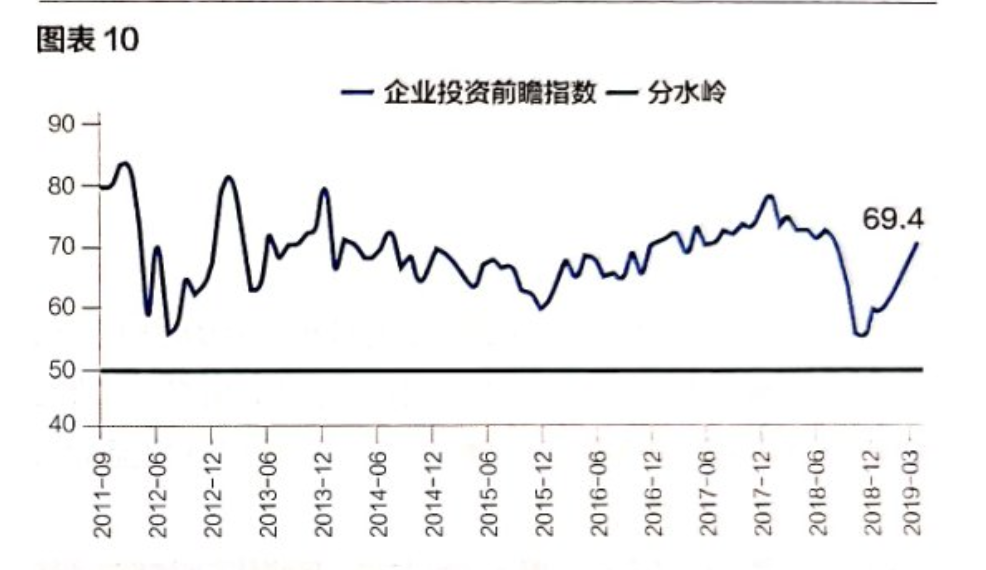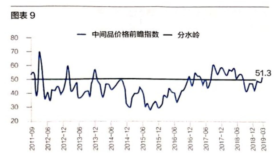 消费品价格前瞻方面,3月的指数为52.4,4月已涨至59.3(图表8);中間品价格前瞻指数4月为51.7,与3月的48.1相比有小幅上升,目前该指数刚好跨过50的分水岭(图表9)。价格端的指数均在上升,这表明经济可能在整体回暖。