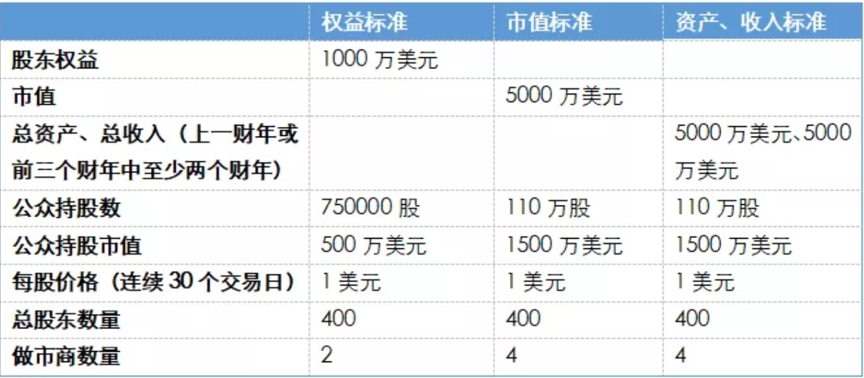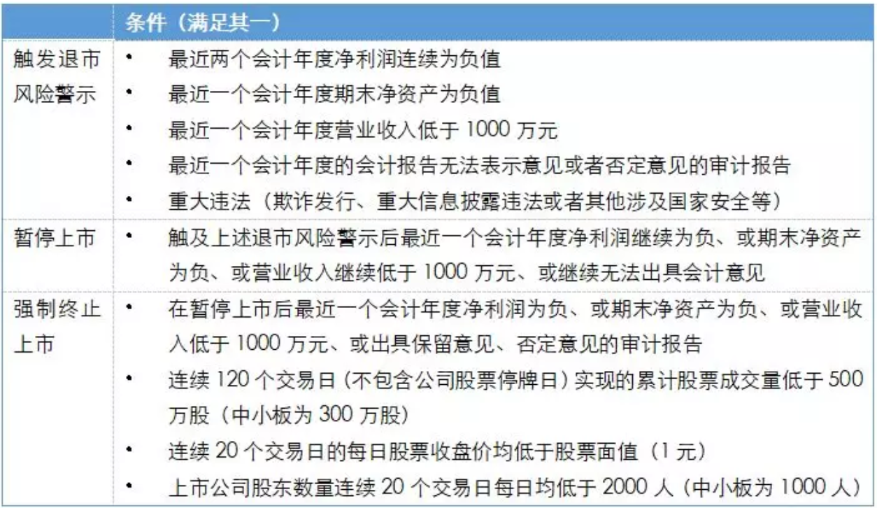 美国股市退市可分为主动退市与被动退市,主动退市又分为后续有交易(从纳斯达克或纽交所转入OTC市场或粉单市场继续交易)与后续无交易(公司被并购或回购股票进行私有化)。被动退市是指触及交易所规定的退市标准而被强制终止上市。纳斯达克全球市场与全球精选市场中必须满足两个条件:每股价格不低于1美元,同时总股东不少于400人。同时还需要满足三个持续经营标准之一,包括权益标准、市值标准与资产收入标准: