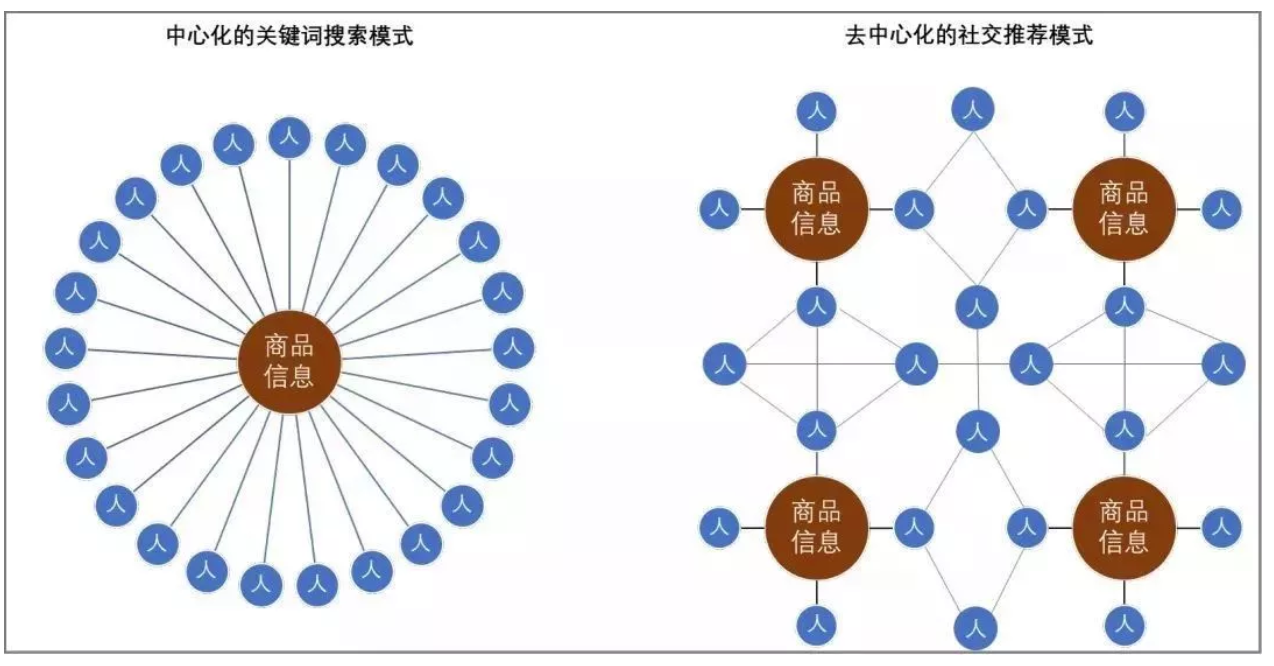 然而,在移动互联网时代,搜索引擎日渐式微,每一个在线用户均成为了一个即时信息分发节点,以微信、微博为代表的移动社交应用占据潜在消费者主要的在线时长,在线社交关系网络日益成为消费者获取、传播商品信息流的重要通道。此时,流量分发模式也从“中心化”的关键词搜索,转为在“去中心化”的社交关系链中的“推荐”,是“信息找人”或者是“货找人”(见圖表1)——这意味着,商品信息将有机会在社交网络中出现“裂变式”的迅速扩散,从而大幅降低电商平台的获客成本。