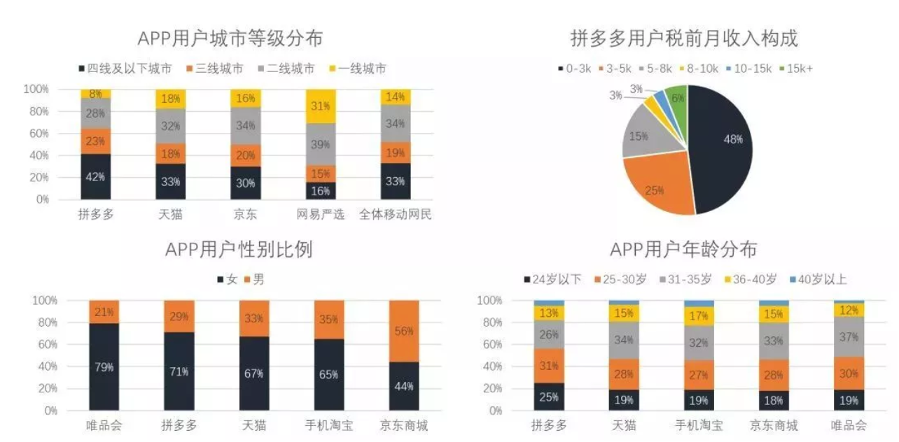 从拼多多用户画像上看,相较于其他主流电商平台,拼多多的用户主要集中在三四线城镇,平均收入水平较低;女性用户比例高达71%,已超过天猫、淘宝和京东,仅次于主打时尚品牌的唯品会;在年龄分布上,拼多多30岁以下用户占比为56%,明显高于其他电商平台。
