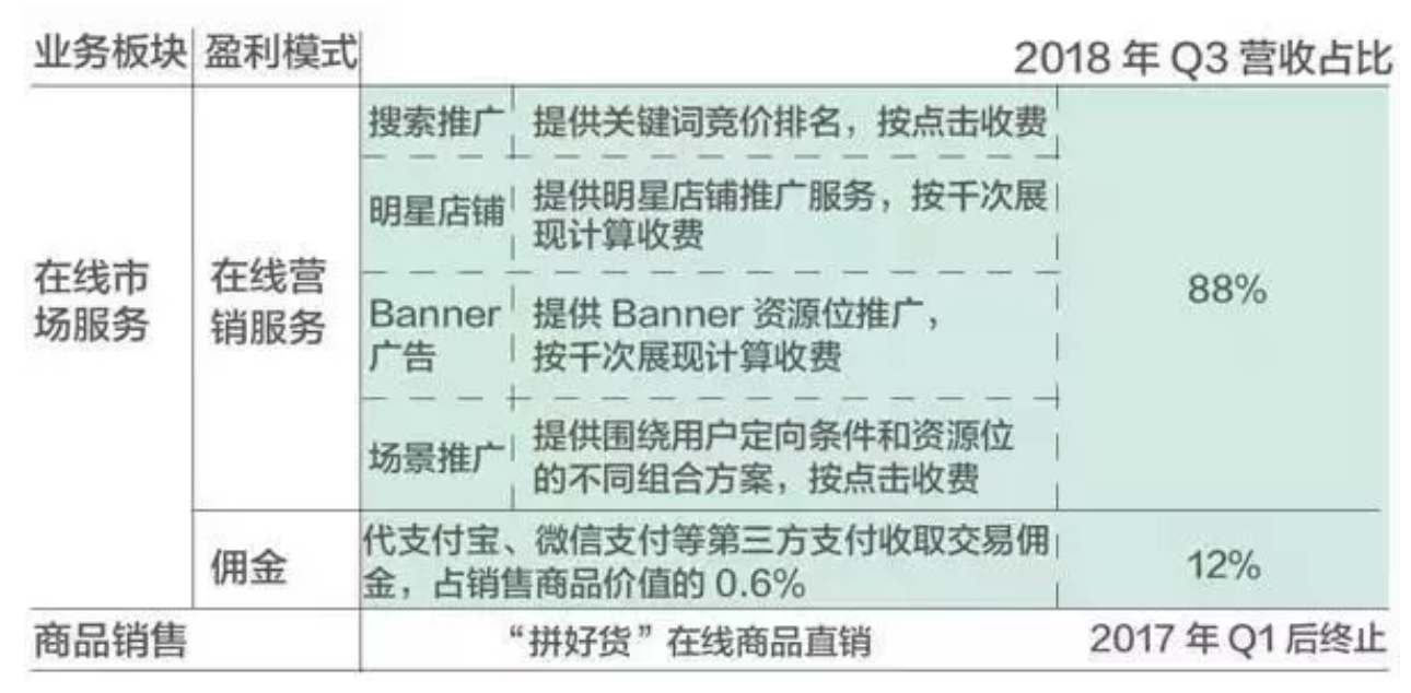 拼多多本质是电商平台,拼多多公司收入构成包括在线营销服务以及佣金收入两部分,其中,在线营销服务主要是向商家收取竞价排名费用以及广告展位费用,佣金费用则是按商家销售额收取0.6%佣金,主要用于向第三方支付服务提供商如支付宝、微信钱包等支付服务费用,公司佣金收入基本与支付服务成本重叠,毛利润主要由在线营销服务业务贡献。