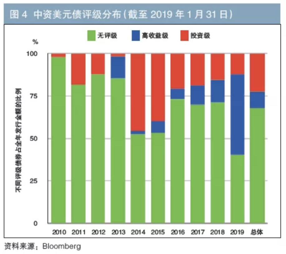 中资美元债的债项评级缺失现象较为严重,且近年来较差资质的中资美元债发行占比上升。从发行只数来看,截至2019年1月31日,在已发行的1560只中资美元债中,有1164只未获得评级,占比近3/4;从发行金额来看,未获评级债券占比接近70%。无论是从发行金额还是发行只数来看,高收益级债券在有评级债券(采用标普评级)中的占比整体呈上升趋势。在2019年1月发行的62只债券中,26只获得评级,其中的高收益级债券有19只,在已获得评级债券中的占比为73%(见图4)。