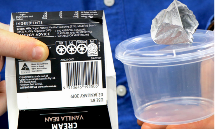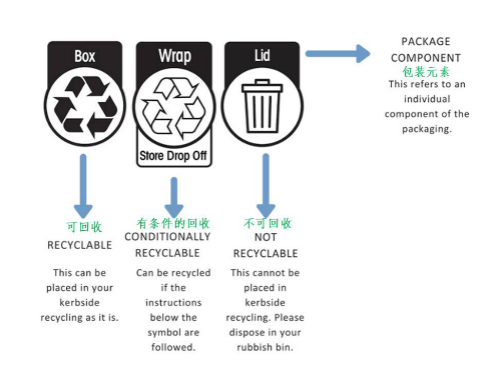 当然另一方面是要让人们清楚明了地知道每一个垃圾到底属于哪一类。 在这方面,除了政府,商家可以发挥很大作用。一方面,可以减少包装中混合材料的运用;另一方面,对于那些确实需要多种材料的产品,明确地在包装上告知消费者应该如何分类。澳大利亚组织Planet Art在2018年9月推出了一种实用的商标体系ARL(Australasian Recycling Label图1),帮助人们更快地从商品的外包装上就能判断出商品包装的每个元素该投进什么类别的垃圾桶。目前已经有超过50家澳大利亚商业组织加入这个项目,并积极推行使用这种新的包装商标,包括Australia Post, Blackmores, Nestlé, Officeworks, Unilever 和Woolworths等。ARL包含三种类型的标识:可回收(Recyclable)、有条件的回收(Conditionally Recyclable)和 不可回收(Not Recyclable)三种。该标识由包装元素名称和是否可回收的图标两部分组成,并集中印制在商品外包装上。以下图2中的酸奶包装为例,从左至右分别说明了塑料碗、盖子、纸套和锡纸的可回收方式,其中前三种为可回收,锡纸则需要挤压成团后再回收。这样的设计可以极大地方便消费者分类垃圾,与此同时也会让率先做出这样标志的商家赢得消费者的好感和信任,从而有效增加品牌竞争力。