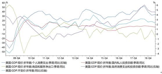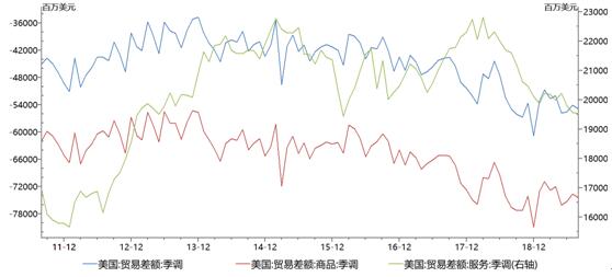 从整体来看,美国个人消费和投资面临下滑压力,政府赤字持续保持10%以上的持续增长,在特朗普减税政策下难以为继,贸易方面,除了服务贸易顺差,商品贸易持续逆差,并且服务贸易顺差2018年下半年以来快速下滑,带动整个贸易逆差在2018下半年以来持续扩大。
