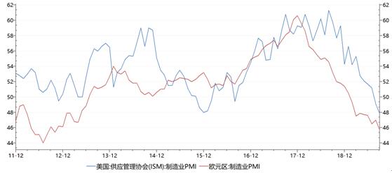 2018年以来,欧美PMI持续下行,但欧洲PMI相对美国下行更快,截至2019年9月份,欧元区制造业PMI45.7,而同期美国制造业PMI47.8,美欧经济虽然都同比下滑,但美国经济依然相对强于欧洲。