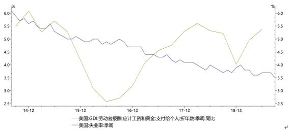 随着贸易摩擦推进,对美国消费者信心也产生一定影响,密西根大学统计的消费者信心指数显示9月份消费者信心指数93.2,而8月份消费者信心指数89.8,创下2017年以来新低。消费者信心指数下降很大部分来自于对贸易摩擦下经济增长的不确定性,虽然从就业以及劳动者报酬来看,美国当前依然保持着强劲的就业率及劳动者报酬增长率。美国经济增长的信心主要来自消费,而消费主要看工资与失业率。2019年2季度,支付给个人的工资和薪金同比增长率5.37%,截至9月份,美国失业率季调后为3.5%,失业率持续保持低位,同时劳动者报酬增长率2019年来出现反弹。